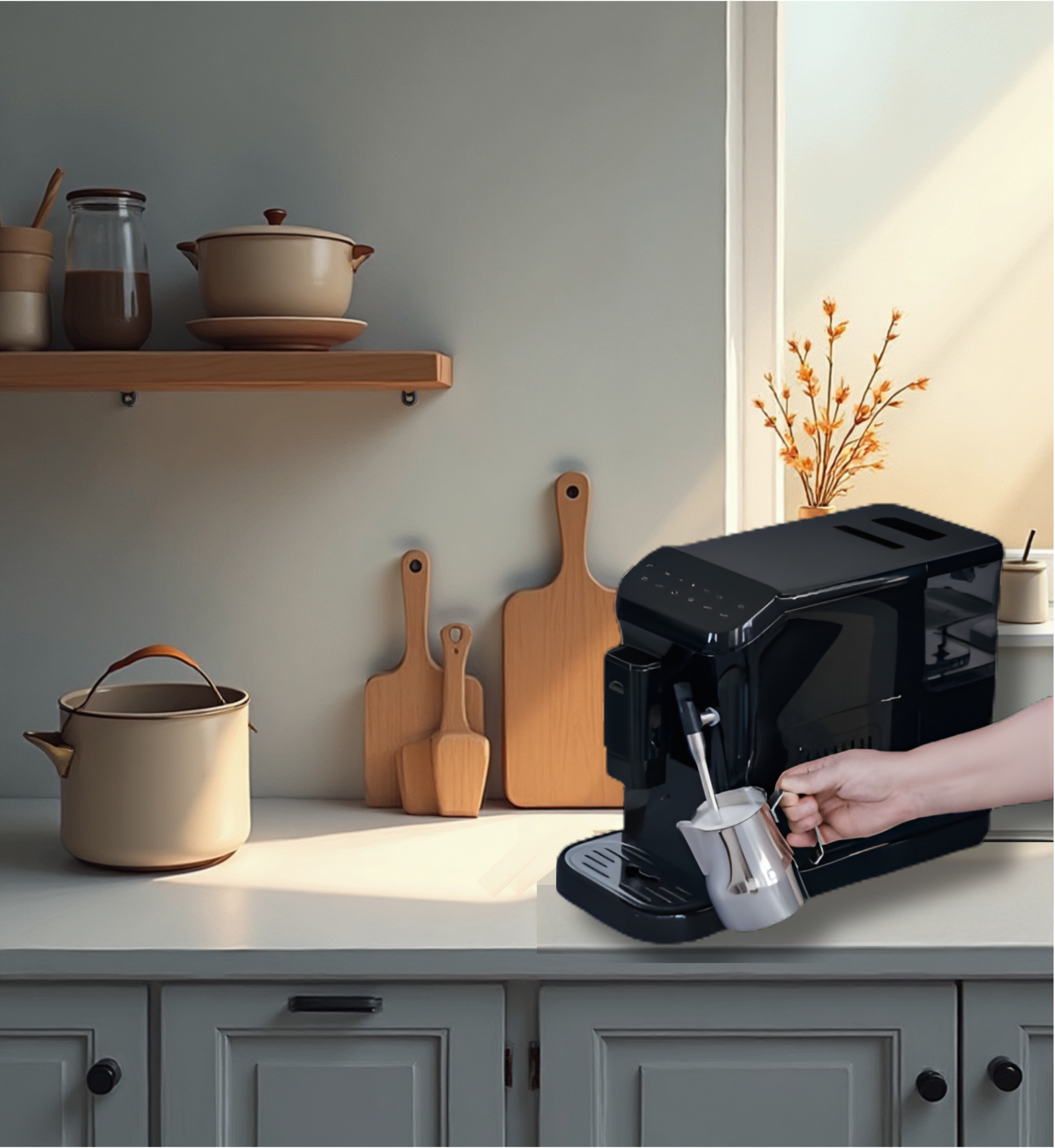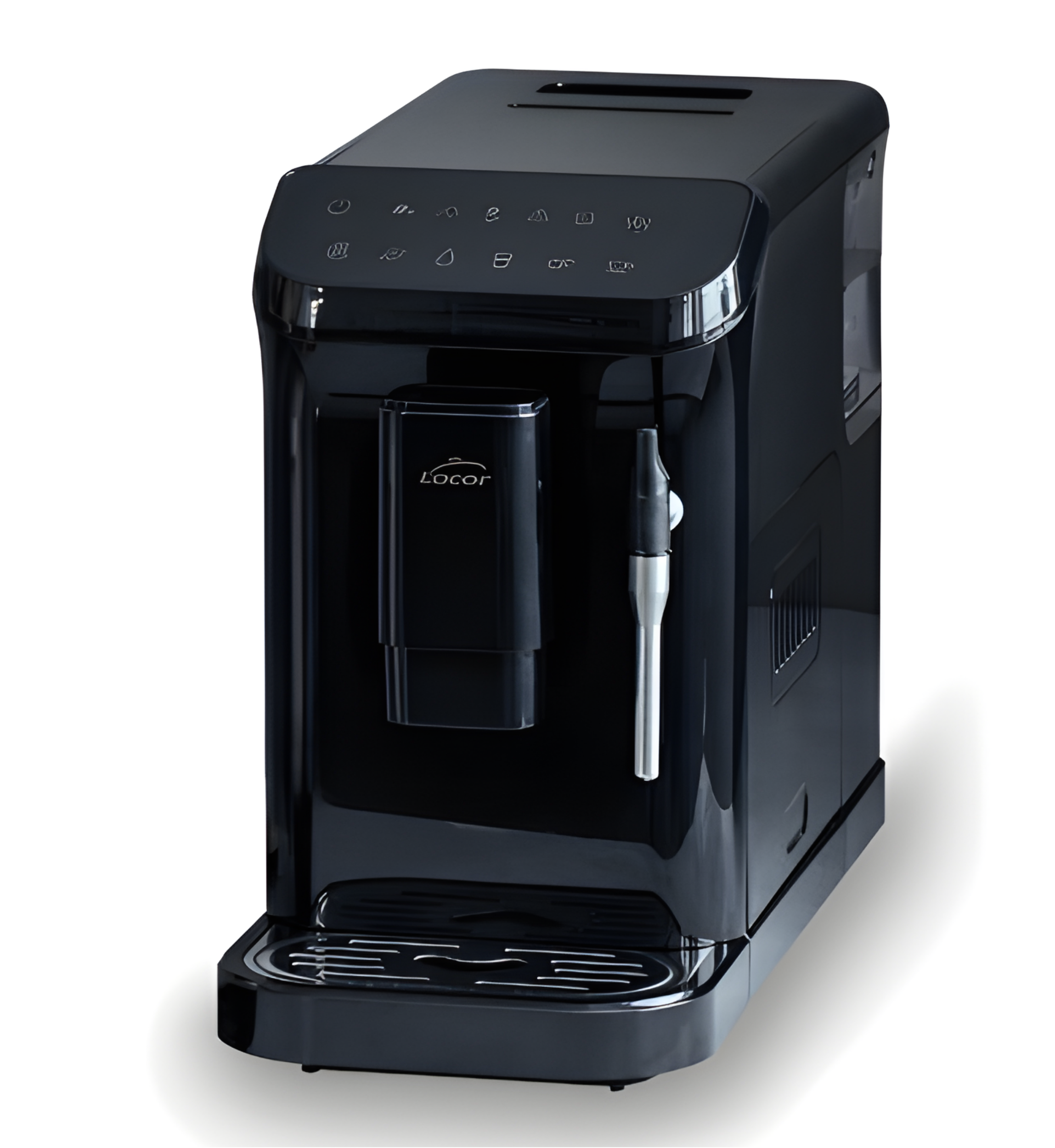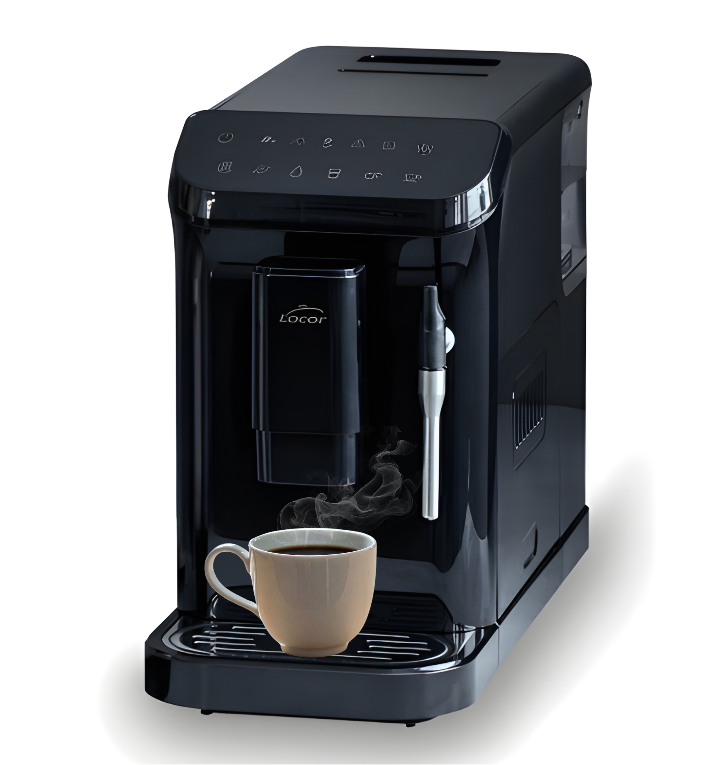 Equipada con molino cónico ajustable de 5 niveles, bomba de 19 bares, pantalla táctil LED y función de autolimpieza, ofrece una experiencia completa, intuitiva y con resultados constantes. Su diseño elegante, compacto y con acabados en negro mate y acero inoxidable la convierte en una opción ideal para hogares modernos, oficinas o rincones de café premium.